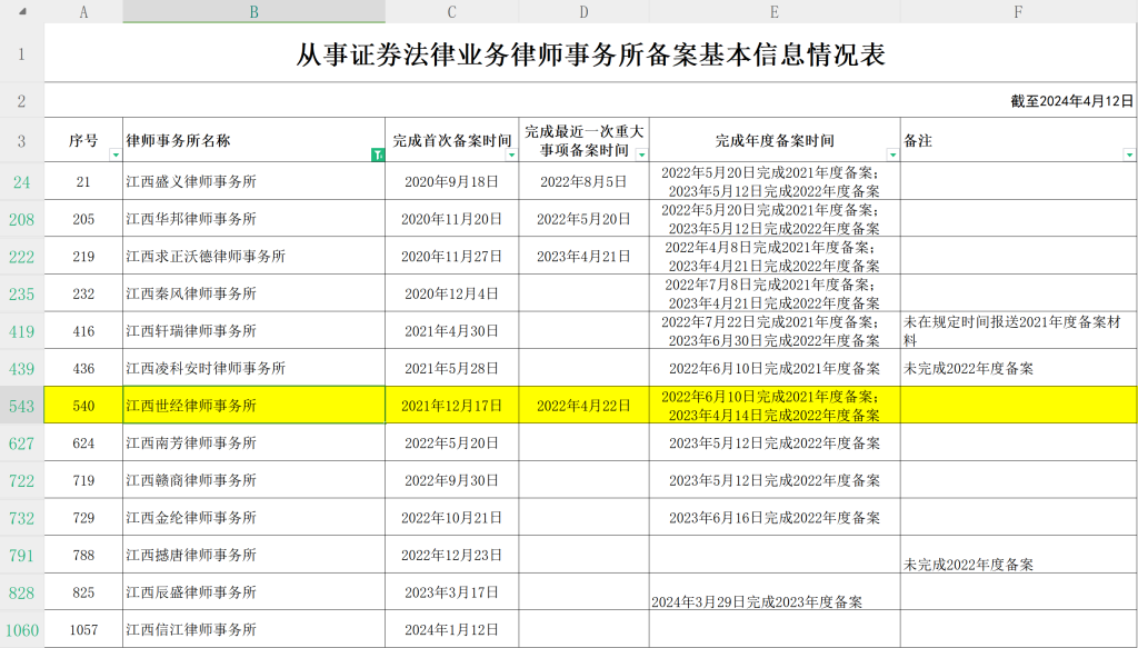 从事证券法律业务律师事务所备案基本信息情况表(截至2024年4月12日)